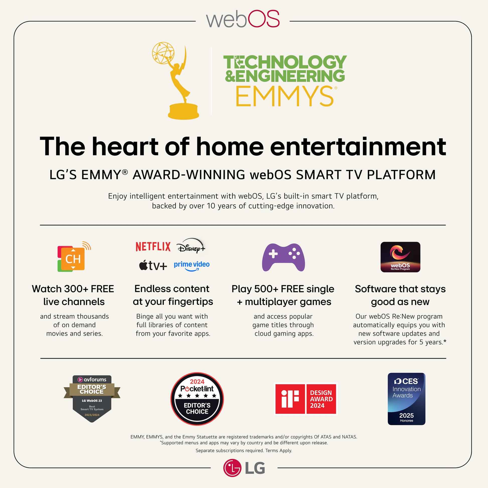 - WEBOS: No matter which TV you choose, your LG TV makes it easier than ever to find what you need and more. Browse all your favorite streaming apps and let LG Channels connect you to over 350 free channels and thousands of titles on demandÂą