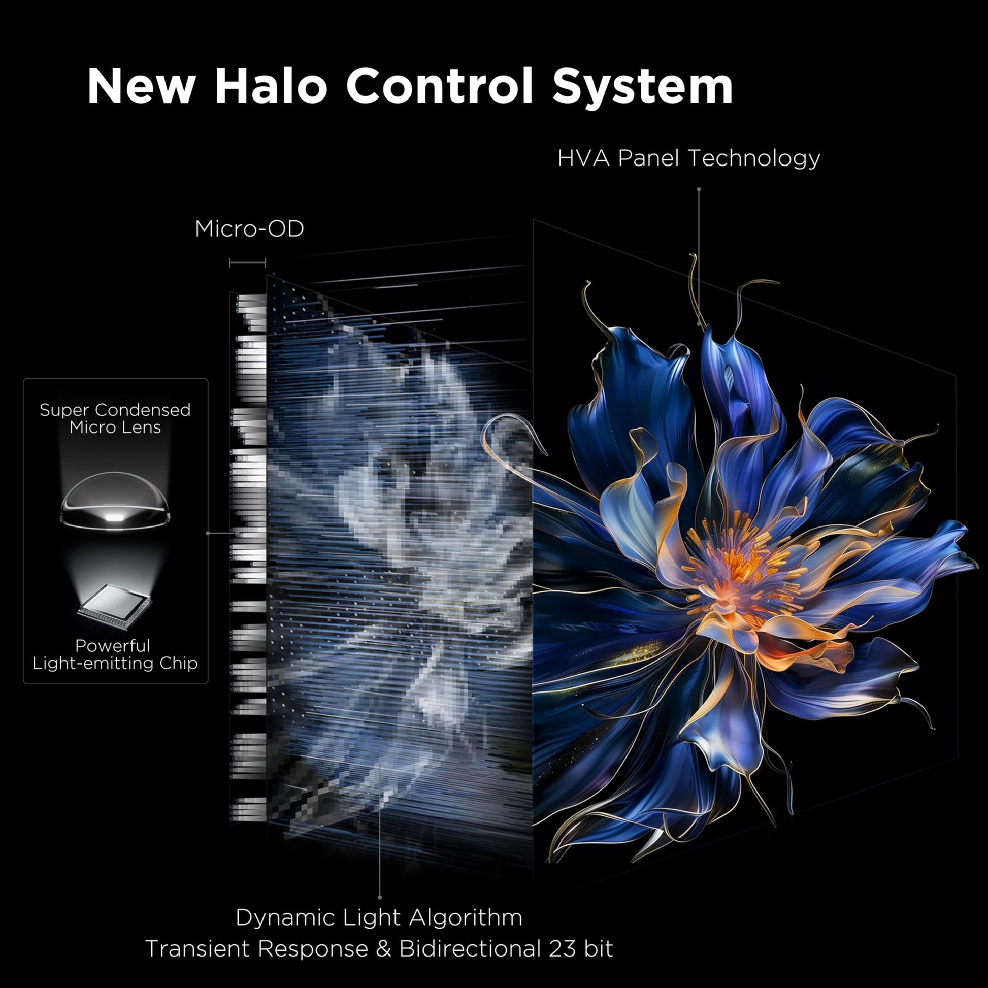 - Advanced Halo Control System: Includes Super High Energy LED Microchip, Super Condensed Micro Lens, Micro-OD Reduced Optical Distance, High Contrast HVA Panel, Enhanced QLED, Zero Delay Transient Response, Bi-direction 23-bit Backlight Controller, and Dynamic Light Algorithm for “Halo-Free” images.